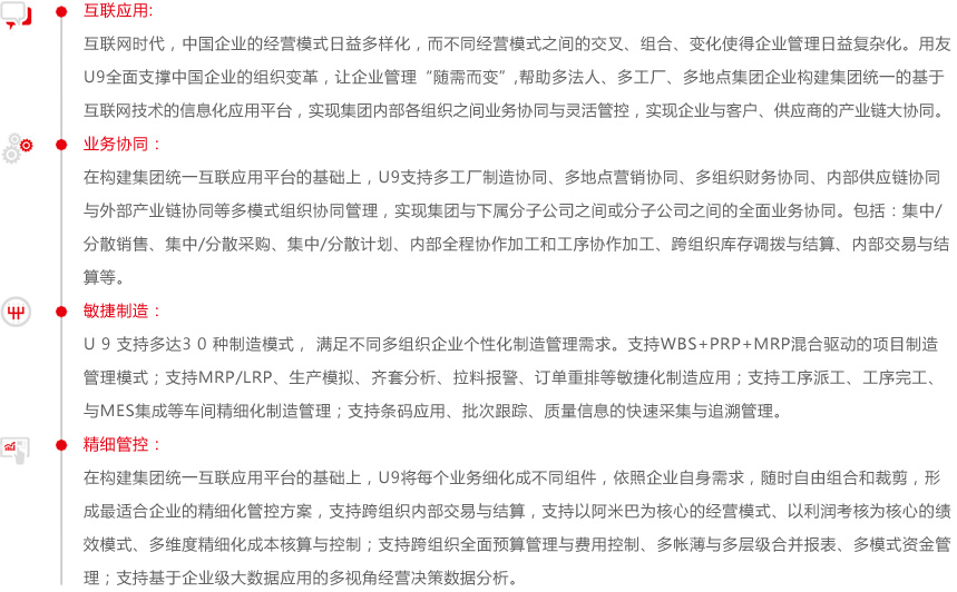 用友U9秉承互联网基因,是全球第一款基于SOA云架构的多组织企业互联网应用平台。U9以精细化管理、产业链协协同与社交化商业,帮助多组织企业(多事业部/多地点/多工厂/多法人)在互联网时代实现商业模式创新、组织变革与管理升级。